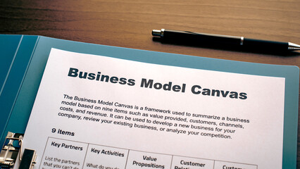 There is dummy documents that created for the photo shoot on the desk about Business Model Canvas.