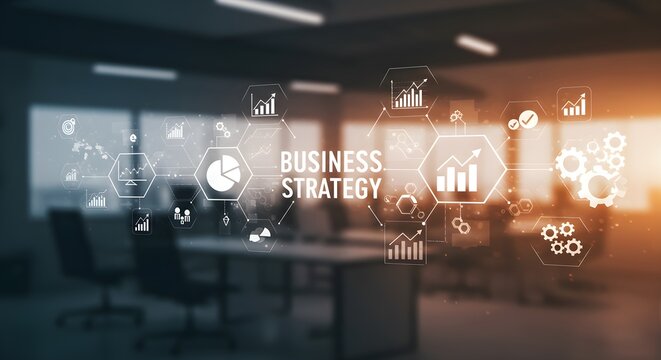 Business strategy overlay with charts and graphs in a modern office setting, suggesting planning and growth.
