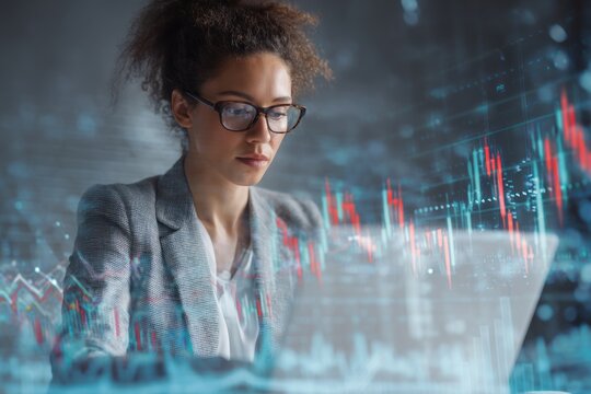Woman with glasses works on laptop with financial graphs overlaying the scene.