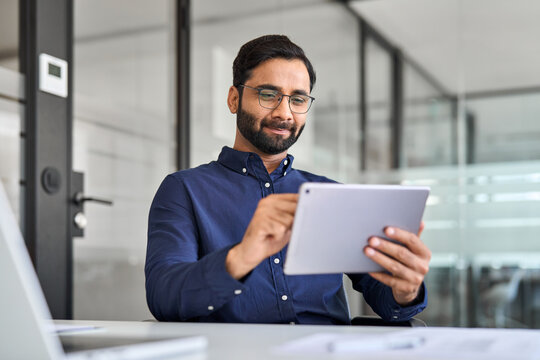 Busy Indian business man ceo manager using tablet computer, male employee or executive looking at tab device analyzing corporate digital project data working on pad sitting at office desk.