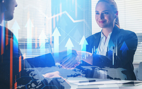Two businesspeople shake hands in office setting with creative digital graphics of arrows, charts, and world map overlayed, symbolizing business success