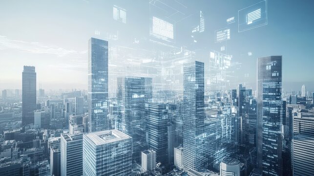 Financial data and digital analytics overlay on urban skyline