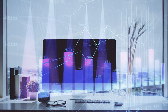 Stock market graph and table with computer background. Double exposure. Concept of financial analysis.