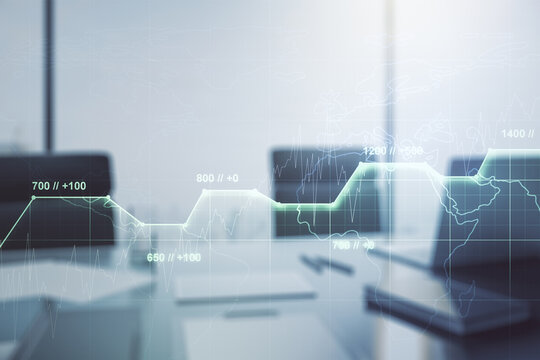 Double exposure of abstract creative statistics data hologram and modern desk with computer on background, analytics and forecasting concept