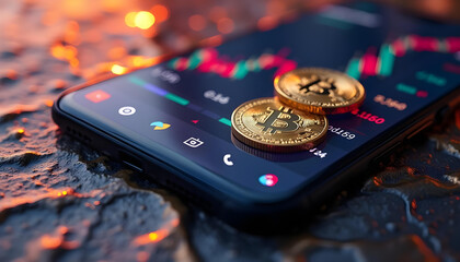 Cryptocurrency trading on smartphone with Bitcoin coins on textured surface. screen displays market trends and price fluctuations, reflecting digital finance world
