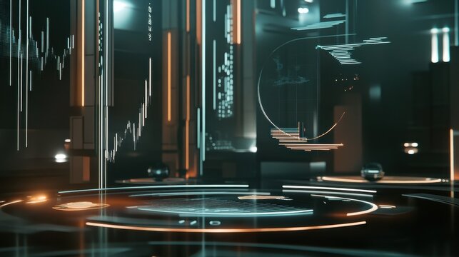 A futuristic financial analysis scene with holographic charts and graphs floating in mid-air.