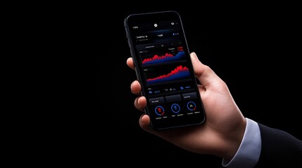 Mobile Business Analytics: A hand in a business suit holds a smartphone displaying a data dashboard with graphs and charts, showcasing a modern approach to tracking business performance.
