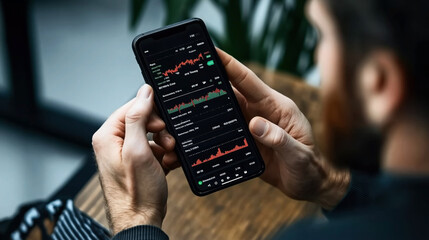A person uses a smartphone with overlapping financial graphs and stock market data, depicting the integration of technology in financial analysis and trading.