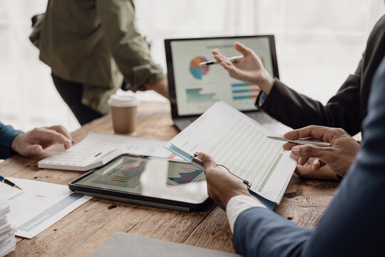 Businessman and businesswoman are in a working meeting with many financial documents on the table. There is busy business profit analysis and brainstorming in the office. Close-up pictures