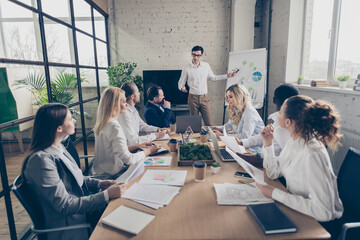 Business trainer stands in front of diverse team makes presentation