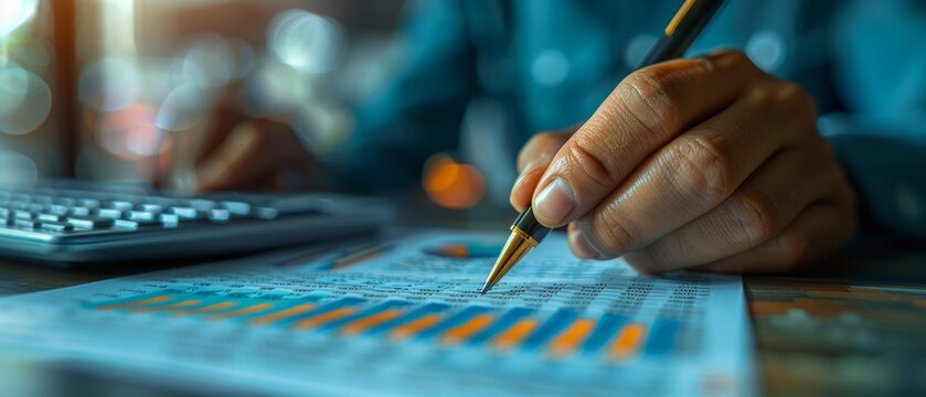 Hand Analyzing Financial Report with Pen and Calculator.
