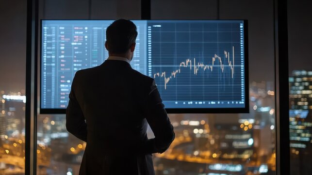 Financial analyst monitoring stock market charts at night with data visualization overlays