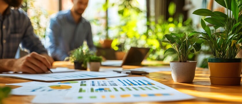 Collaborative business meeting with financial data analysis
