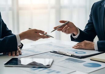 Financial analysts work overtime analyzing data on tablets, laptops, and graphs. Collaboration, teamwork, and planning.