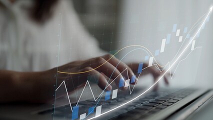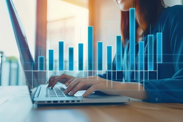 Professional woman using laptop with virtual graph data overlay. Business analytics and technology concept.