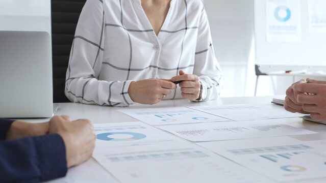 Business meeting with colleagues discussing charts and graphs, analyzing financial reports and strategy plans, teamwork collaboration in modern office setting
