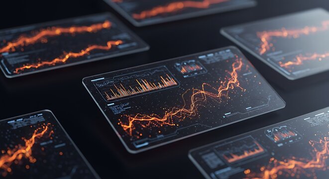 Futuristic transparent tablets display dynamic data visualizations, showing complex financial or scientific information.