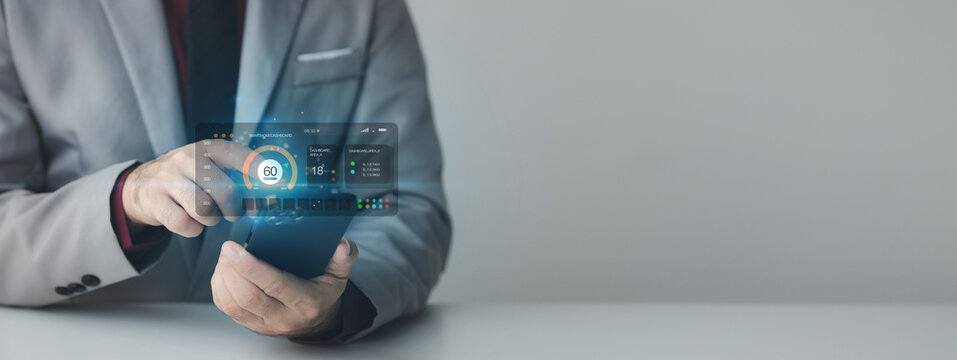 A person is holding a smartphone with a dashboard screen hologram for managing and controlling the smartphone. The concept of using modern technology in communication.