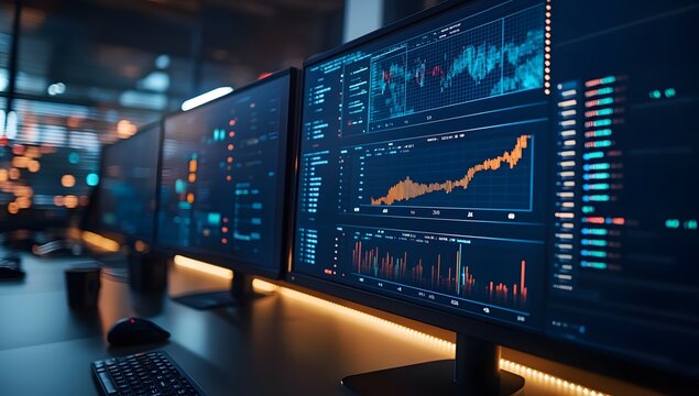 Stock market data on computer screen showing financial graphs and analytics. Evening setting in office with warm lighting enhances focus
