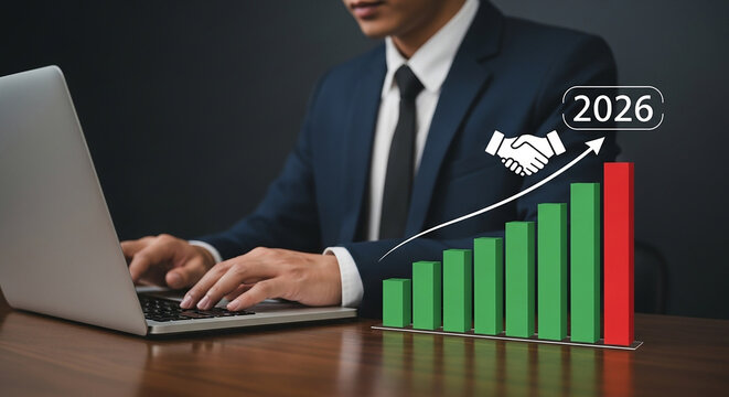 Two business professionals are seen finalizing an agreement, with financial market charts visible in the background