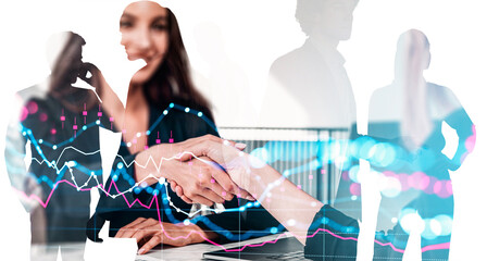 Multi exposure of abstract virtual financial graph hologram on business partners shaking hands background, forex and investment concept
