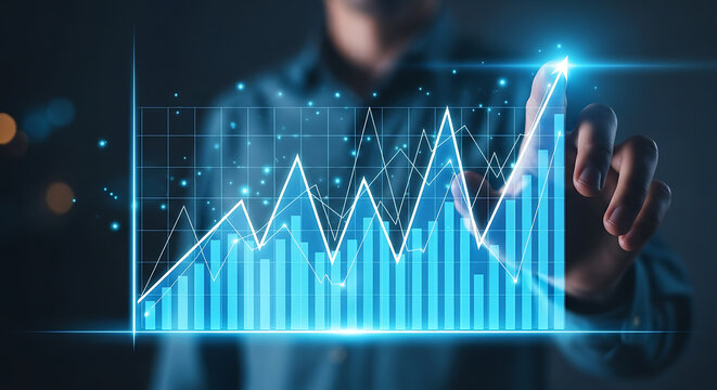 Businessperson analyzing financial graph with glowing chart interface, representing stock market, investment, data growth, and digital financial strategy concept