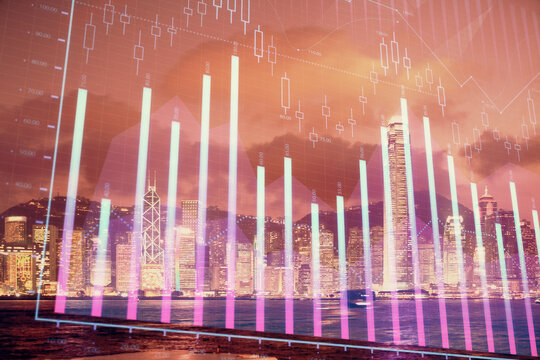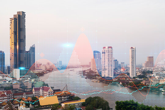 Forex and stock market chart hologram over panorama city view of Bangkok, the financial center in Asia. The concept of international trading. Double exposure.