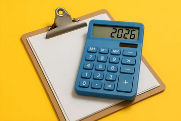 Blue calculator showing 2025 sitting on a clipboard against a yellow background