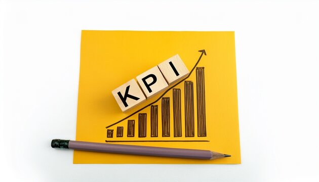 A visual representation of KPIs, featuring blocks spelling "KPI," a pencil, and a graph showing upward trends on a bright yellow background.