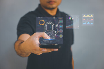 Businessman with digital chart icons and graphs on computer screen for big data analytics and business intelligence concept. Cloud computing