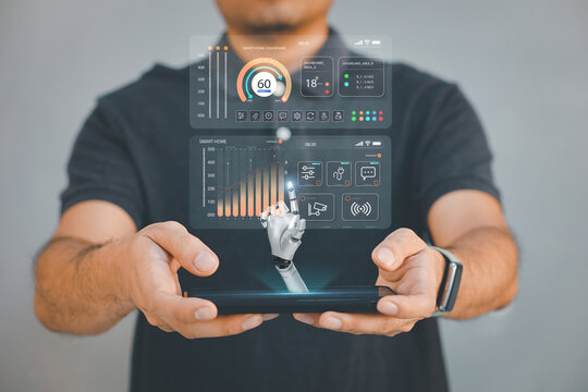 Businessman showing AI technology analyzing financial data stock market. Document data management on network, cyber security, digital transformation. AI learning and business artificial intelligence.