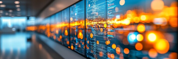 Modern Data Center Multiple Screens Display Analytics, Code, and Statistics with Bokeh Effect