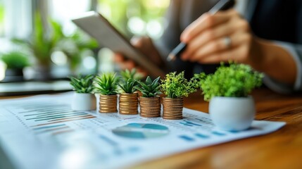 Two potted green plants stand next to two documents displaying financial graphs and data. The scene is set in a clean studio environment with bright, even light