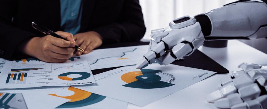 Futuristic financial market graphs and forex charts merging with the silhouette of an robot set against a blue background evoking a cutting edge high tech trading environment through double exposure