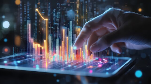 A hand interacts with a digital tablet displaying holographic financial data and stock market analysis, showcasing modern technology and investment trends