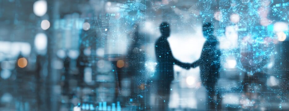 A man in a suit gestures while discussing with another man in a suit, framed by digital charts. The man interacts as financial data overlays the suits prominently.