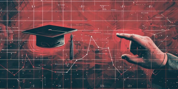 Graph Analysis with Hand and Graduation Cap on Red Gridded Background