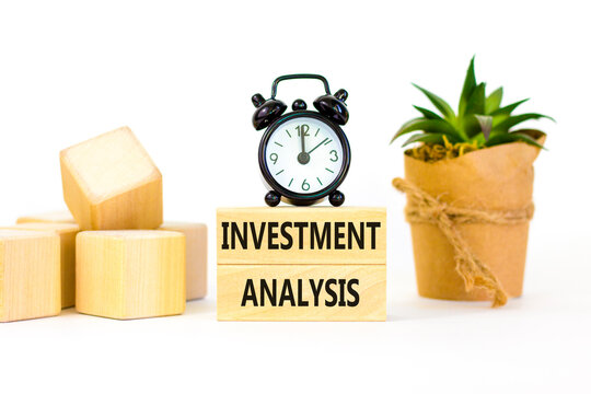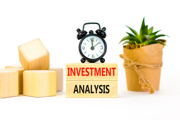Investment analysis symbol. Wooden blocks with concept words Investment analysis on beautiful white background. Black alarm clock. Business investment analysis concept. Copy space.