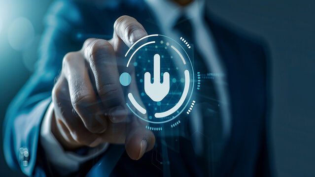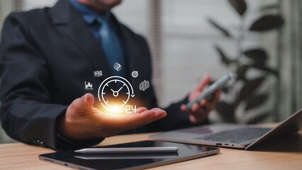 Modern Professionals Hand Projects Tech driven Business Interface In His Office, Displaying Clock Icon With Real-time Data For Future-proof Business Operations