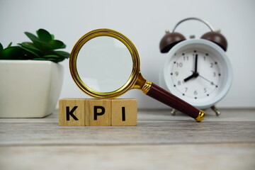 Magnifying glass and alarm clock with wooden blocks alphabet letters KPI text message on wooden background