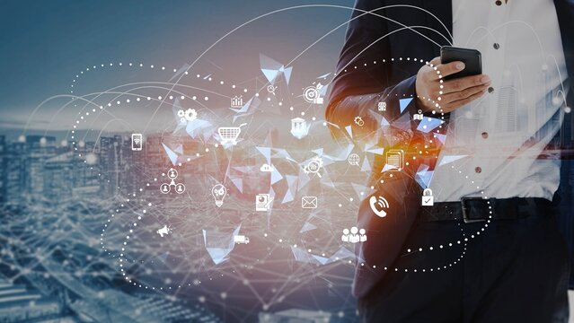 Hands interact with a smartphone displaying various digital icons and data visualizations, embodying the essence of modern business analysis and digital transformation. Crux