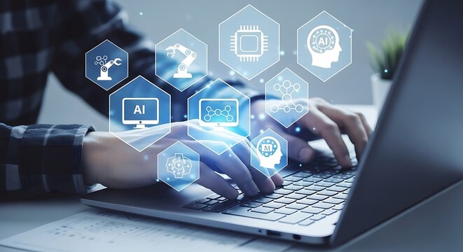 AI Technology Integration - Person Typing on Laptop with AI Icons Overlay.