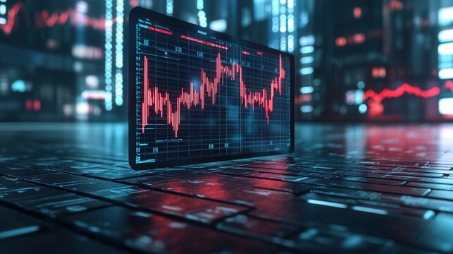 Stock market analysis with a futuristic digital interface showing fluctuating graphs and data in a high-tech environment.