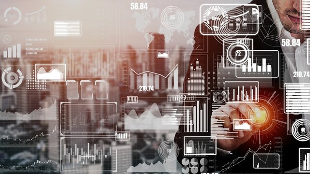 Big Data Technology for Business Finance Analytic conceptual. Modern graphic interface shows massive information of business sale report, profit chart and stock market analysis on screen monitor.