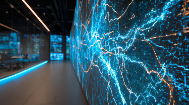 Futuristic data center digital network cyber security blue light neon line server room technology innovation abstract modern office digital wall display glows with dynamic blue network lines