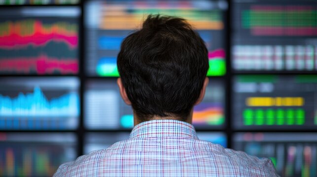 Man Managing Financial Analytics Data On Multiple Computer Monitors In Office