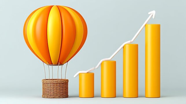 Vibrant Hot Air Balloon Beside Upward Chart on Soft Grey Background