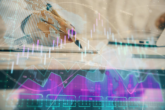 Multi exposure of woman's hands making notes with forex graph hologram. Concept of technical analysis.