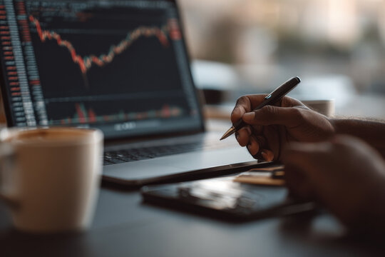 Close up of a hand using a pen to write notes on a document featuring financial graphs and data charts