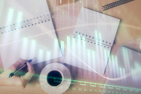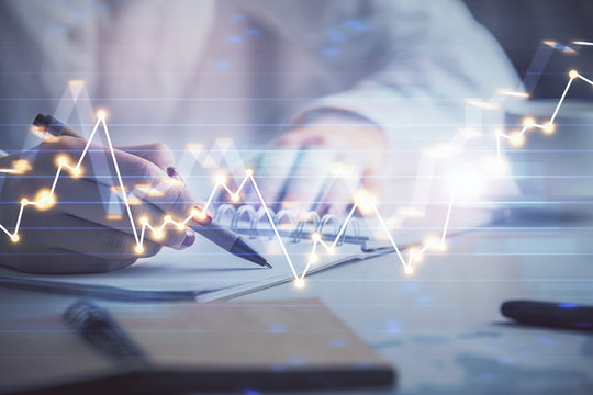 Double exposure of woman's hands making notes with forex graph hologram. Concept technical analysis.